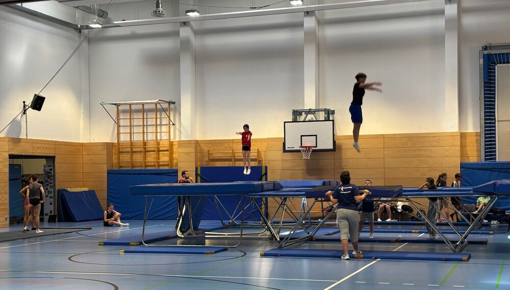 Vom 18.08.2021 bis 20.08.2021, stand für 13 Aktive ihr Lieblingssport Trampolin im Mittelpunkt. Mitglieder der Breitensport und -Leistungssportgruppen hatten für eine Woche Gelegenheit ausgiebig zu trainieren. Der erste Tag wurde zum Kennenlernen untereinander und einem Leistungscheck genutzt. Wo stehe ich? Was will ich an neuen Sprüngen, Sprungverbindungen und Übungen lernen? Gut, dass mit Stefan Krapp und Lisa-Marie Schütz zwei kompetente TrainerInnen zur Verfügung standen. Mit ihren Anweisungen, Tipps und Hilfestellung waren auch schwierige Sprünge und komplexe Bewegungsabläufe zu meistern. Ein Trainingstag begann natürlich auch im Sommercamp, mit Aufwärmen, Dehnungs- und Kraftübungen. Nur, dass das mit einem flotten Tanz und bei fetziger Musik gleich gute Laune gemacht hat. Am Vormittag wurde intensiv gearbeitet. Da war die, in der Mittagspause an den von den Eltern spendierten leckere Verpflegung wie Nudelsalat, Brezeln, Obst, Rohkost, Burger, mehr als willkommen um wieder Energie zu tanken. Nachmittags war Zeit, das Gelernte weiter zu üben und zu festigen. Oder aber einfach mit und auf und am Trampolin Spaß zu haben, zu spielen, zu reden und was sonst noch so wichtig ist. Immer mit dabei die Betreuer Chris Loyda und Daniel Ammenn, die unermüdlichen Übungsleiter, Mattenschieber, Ratgeber - einfach die Männer für alle Fälle. Trotz Muskelkater und kleineren Blessuren hatten alle TeilnehmerInnen jeden Tag aufs Neue Freude in der Halle des TSV bis zur letzten Abschiedsstunde am Freitagnachmittag. Eine gelungene Veranstaltung, das wird an den gezeigten neuen Fähigkeiten und den verschwitzt lächelnden Gesichtern deutlich.