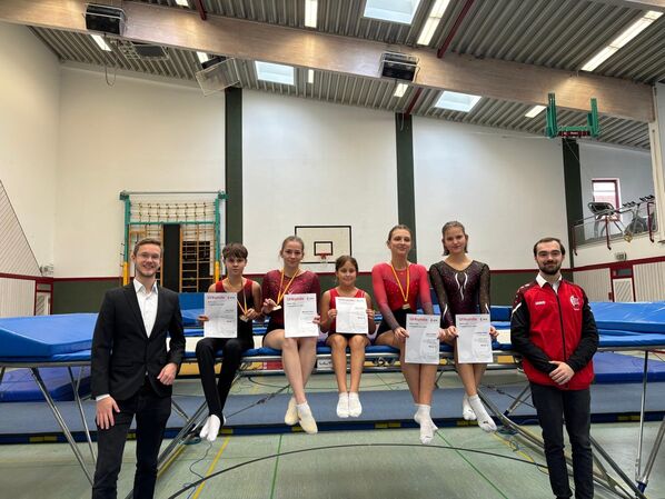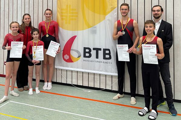 Unsere Aktiven der Leistungsgruppe kämpften bei den Badischen Einzelmeister-schaften im Trampolinturnen um eine gute Platzierung. Besonders gut gelang dies Georg Bensak, der nach drei sauber geturnten Übungen die Silbermedaille der AK 17+ in Empfang nehmen durfte. Aufgrund der geringen Teilnehmerzahl an männlichen Aktiven starteten in der Altersklasse 15-16 Jahre die männlichen und weiblichen Teilnehmer gemeinsam. In diesem starken Teilnehmerfeld landete Armir Kaiser auf Platz 7. Als jüngste Teilnehmerin in der Altergruppe 11-12 Jahre startete Irma Schmitt und verpasste mit dem 4. Rang nur knapp einen Podestplatz.