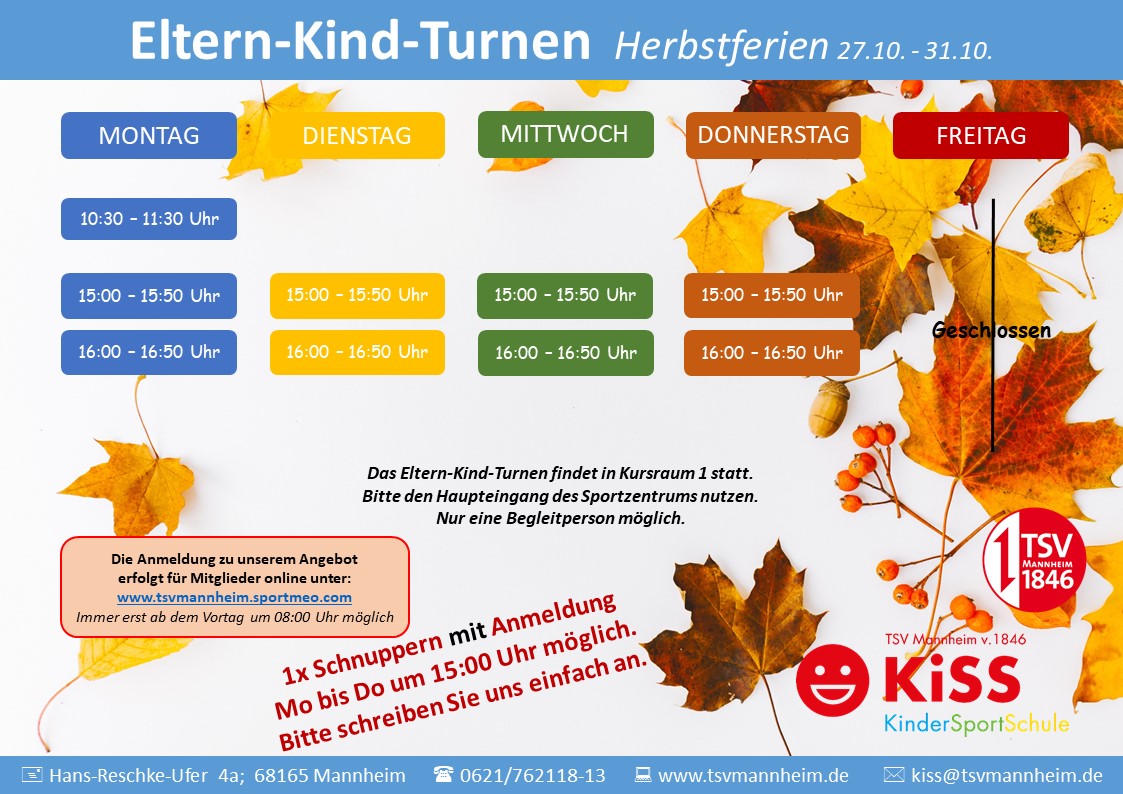 Um sich das Angebot anzuschauen, ist das "Schnuppern" von Montag bis Donnerstag zu unseren 15:00 Uhr Terminen möglich, Kontakt per Mail an kiss@tsvmannheim.de.