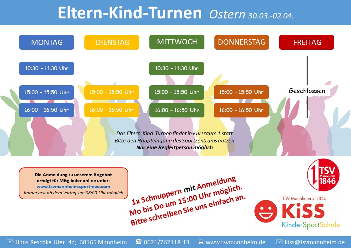 Um sich das Angebot anzuschauen, ist das "Schnuppern" von Montag bis Donnerstag zu unseren 15:00 Uhr Terminen möglich, Kontakt per Mail an kiss@tsvmannheim.de.