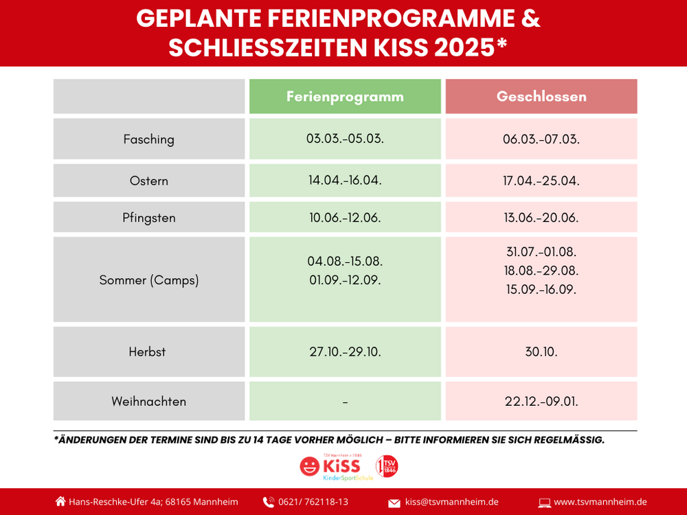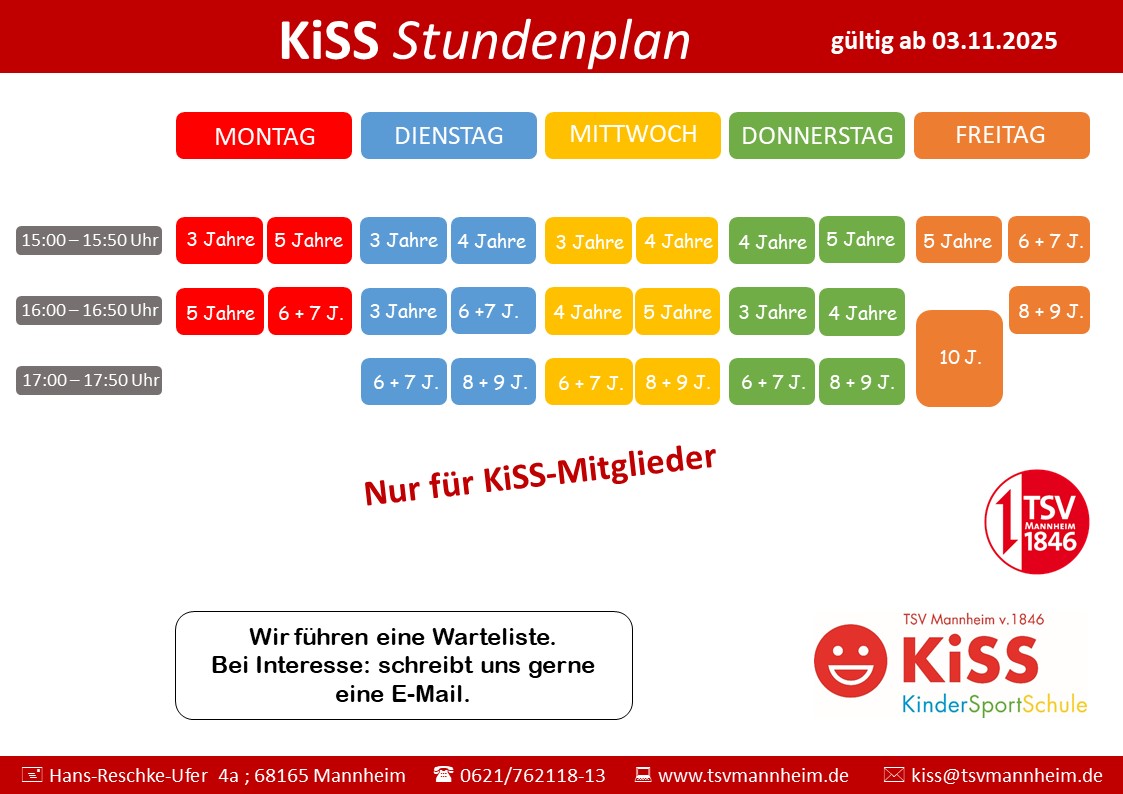 Aufgrund der immensen Nachfrage nehmen wir momentan keine Kinder (aller Altersklassen) auf die Warteliste für die Kindersportschule auf.