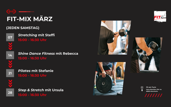Auch im März erwartet euch beim FIT MIX ein abwechslungsreiches Programm aus Bewegung, Kräftigung und Mobilisation. Jeden Samstag bieten wir euch wechselnde Kurseinheiten mit unterschiedlichen Trainingsschwerpunkten. Von entspannendem Stretching über energiegeladenes Dance Fitness bis hin zu kräftigendem Pilates und funktionellen Workouts ist für alle etwas dabei.
