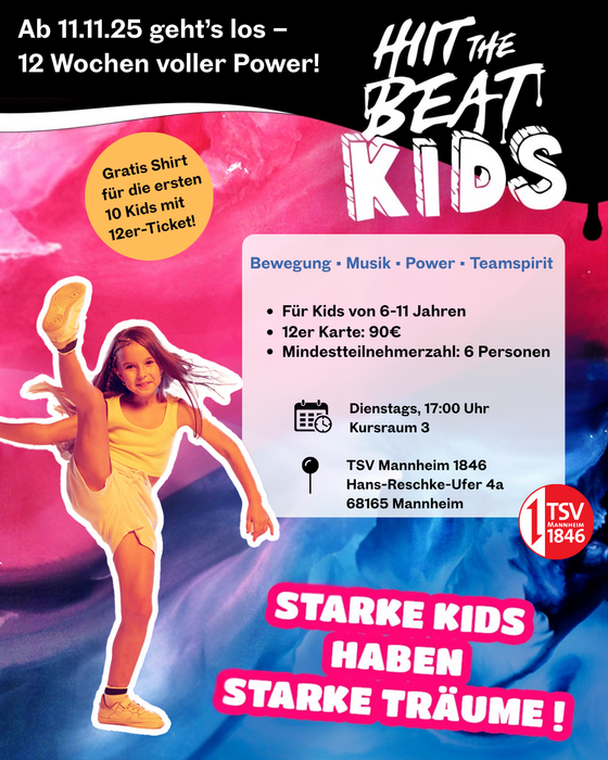 Bei Hit the Beat Kids erwarten dich coole Moves zur Musik, kreative Gruppenübungen, spannende Challenges und jede Menge Spaß an Bewegung. Ob stark wie ein Baum, fit wie ein Turnschuh oder cool wie ein super Breakdance-Profi – hier kann jedes Kind zeigen, was in ihm steckt! Unsere Übungen sind speziell für Kinder von 6 bis 11 Jahren gemacht – mitmachen kann jede und jeder. Entdecke wie viel Power in dir steckt! Weitere Infos findet ihr hier.